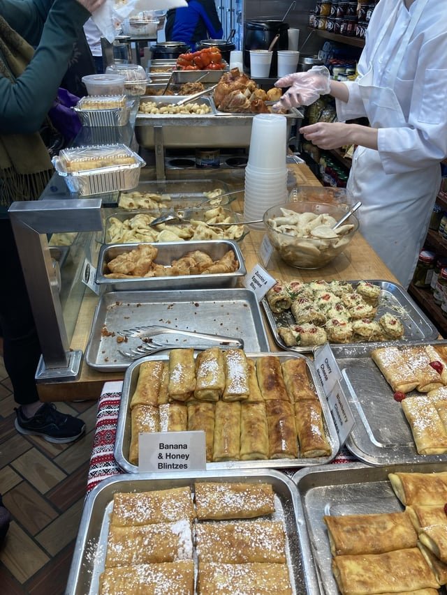 I know there are other, possibly cheaper places in the city to get this sort of food, but there aren’t as many options in Lower Manhattan as there used to be and I’m very glad these guys are still around. I don’t do this every Saturday—we’re not exactly talking health food here—but every so often it’s fun to hike over from the WV and return with a bag full of varenyky (potato-and-onion is the best IMO), sausages, bigos, meatballs, blintzes, you name it. Hell, take your bounty over to Astor Place and enjoy a Slavic feast without bracing Veselka’s weekend lines. Today they had a little sample tray by the register with rye, kielbasa, and a really good spicy mustard.