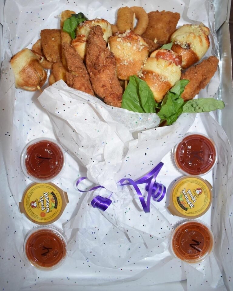 Hold My Knots in Hillsdale, NJ is serving up bouquets made of chicken fingers, onion rings, mozzarella sticks, fried ravioli and garlic knots.