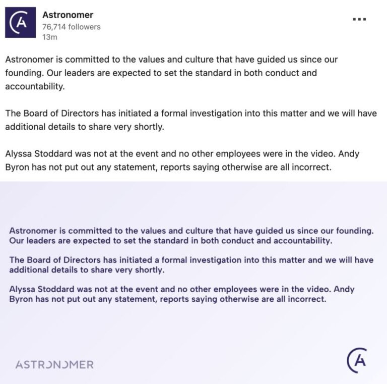 The tech company run by a CEO exposed having an alleged affair with his head-of-HR mistress on a “kiss cam” at a Coldplay concert released a statement on Friday.