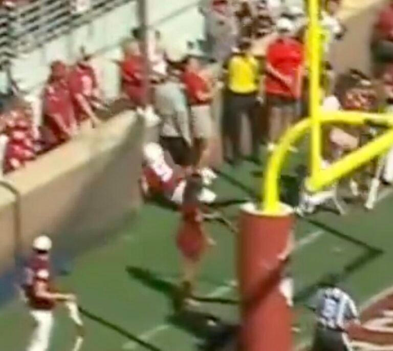 Oklahoma wide receiver Keontez Lewis slammed his head into the brick wall past Oklahoma’s end zone while attempting to catch a touchdown pass in a scary scene during Saturday’s game against Kent State.