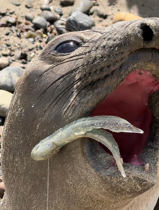 Adorable elephant seal pup is found with huge fishing hook caught in its mouth
