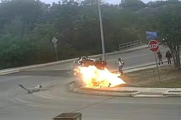 Motorcycle skids off the road and explodes — narrowly missing school kids — in insane video