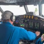 An outside view showed cloudy blue skies off to the side of the aircraft while the crew plowed into the heart of Hurricane Melissa, which had wreaked havoc throughout the Caribbean islands.